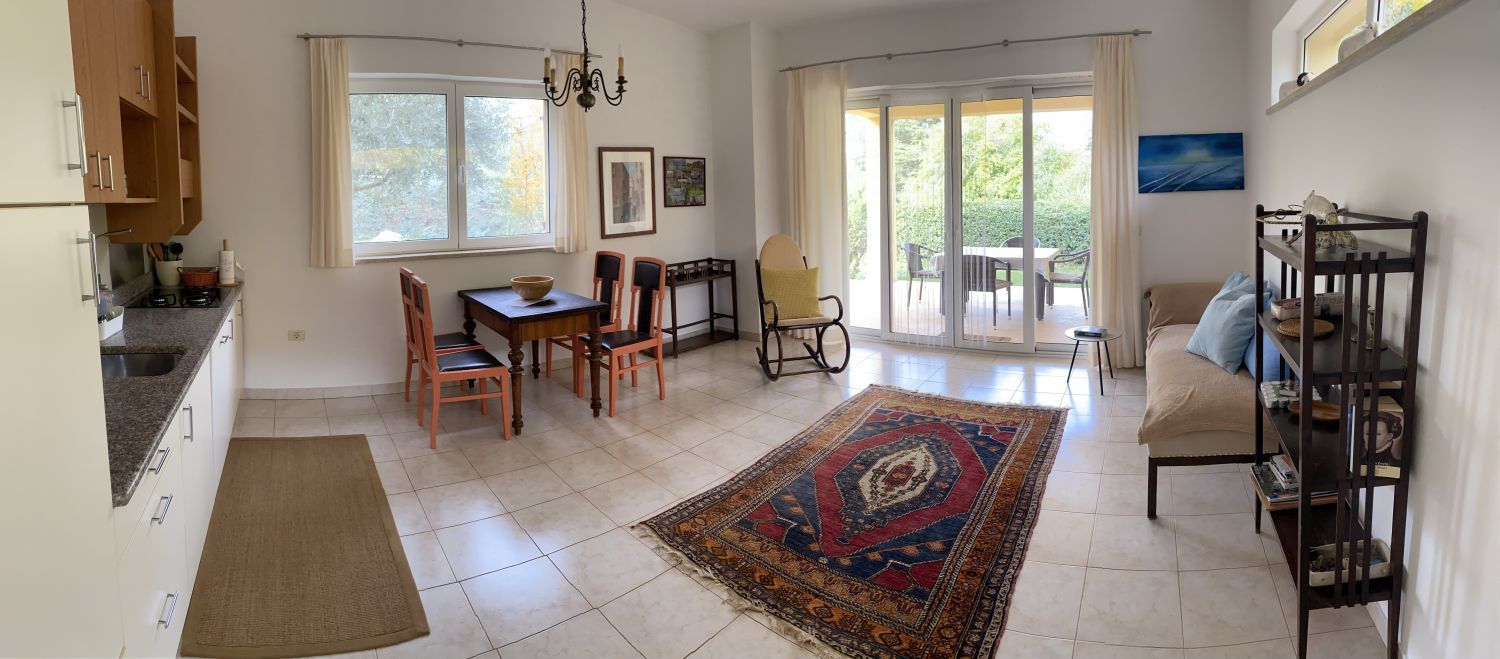 Das Apartment A besteht aus drei Schlafzimmern (1 Doppelzimmer und 2 Zimmer mit je zwei getrennten Betten), einem Badezimmer mit Dusche, WC und Waschtisch sowie einem eigenen Gäste-WC. Der Wohn-/Essbereich verfügt über eine Küche, Esstisch mit 6 Sesseln und einer kleinen Leseecke. Vom Wohn-/Essbereich erreicht man eine 20 Quadratmeter große Terrasse mit Esstisch und 8 Sitzplätzen.